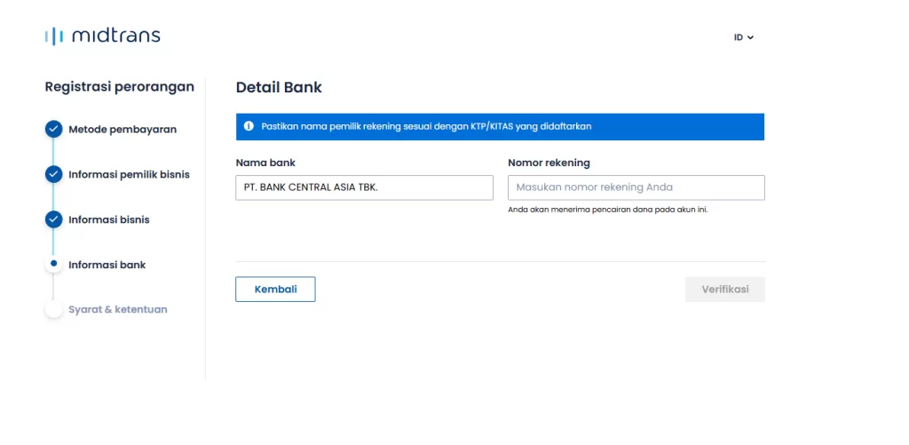 4. Selanjutnya Isikan Bank yang ingin digunakan untuk penarik uang yang masuk di Midtrans