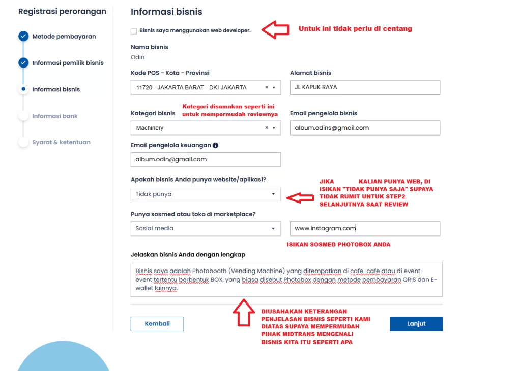 Supaya mempermudahkan Midtrans untuk mereview bisnis kita, kalian bisa isikan seperti contoh kami diatas