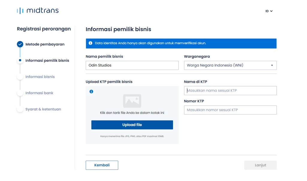 2. Setelah melanjutkan akan masuk kehalaman berikutnya yaitu informasi pemilik bisnis seperti gambar berikut
